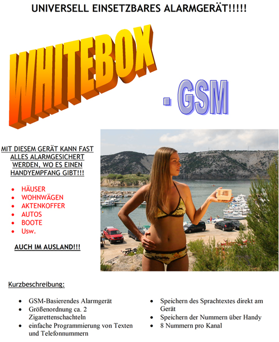 Die White-Box ist ein Gerät für ein selbstständiges Anwählen von Telefonnummern und Absetzen von zwei Sprachtexten je 10 Sekunden. Erforderlich ist dazu eine Telefonsimkarte, die von verschiedenen Anbietern